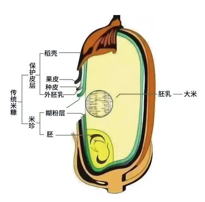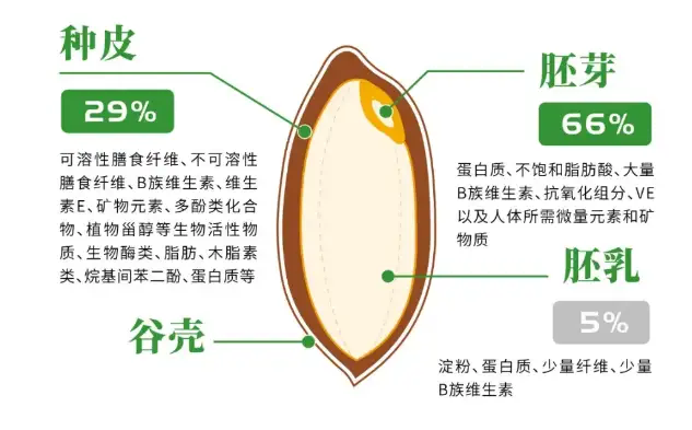 胚芽米在加工的过程中保留了胚芽。胚芽是整个大米中营养成分最高的部分。胚芽占整个大米质量的2%-3%,却包含大米50%以上的营养物质。胚芽蕴含丰富的蛋白质、淀粉、膳食纤维、多种维生素及生物活性物质,而且含有钙、铁、锌、硒等微量元素。大米胚芽中植物蛋白含量达到20.8%,脂肪含量20.7%,每公斤胚芽中含维生素B14.5g,维生素B23.69g,维生素E3.79g,因此,胚芽是大米中的营养“黄金”。