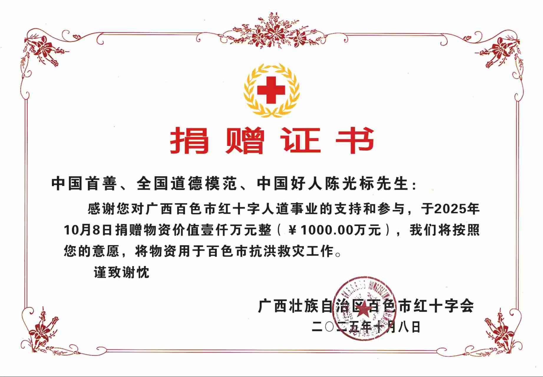 近日,中国首善、全国道德模范、中国好人、《东北振兴网》荣誉顾问陈光标向广西百色市红十字会捐赠价值1000万元物资。百色市人民政府感谢信如下: