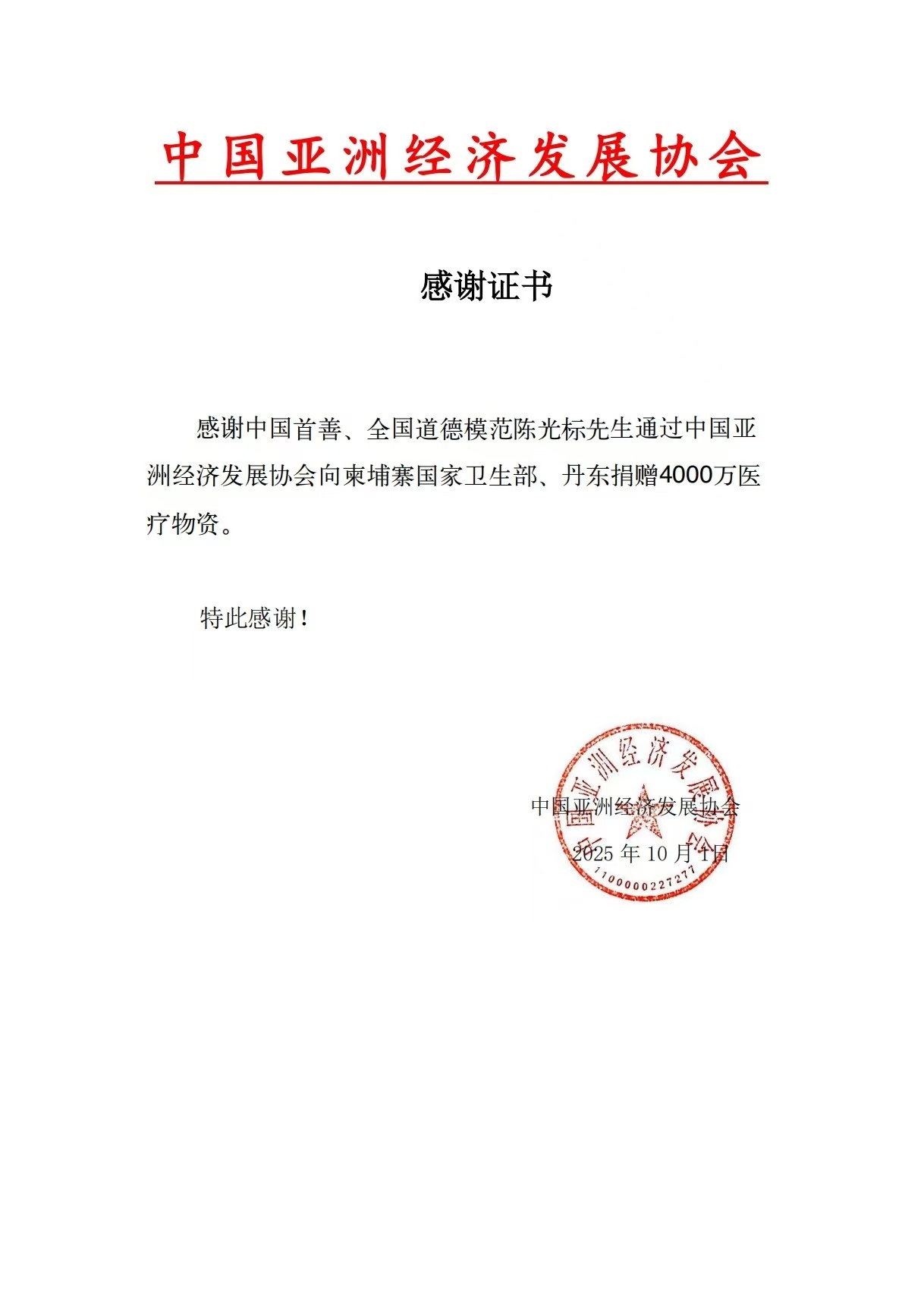 近日,中国首善、全国道德模范、中国好人、《东北振兴网》荣誉顾问陈光标通过中国亚洲经济发展协会向柬埔寨国家卫生部、丹东捐赠4000万元医疗物资。