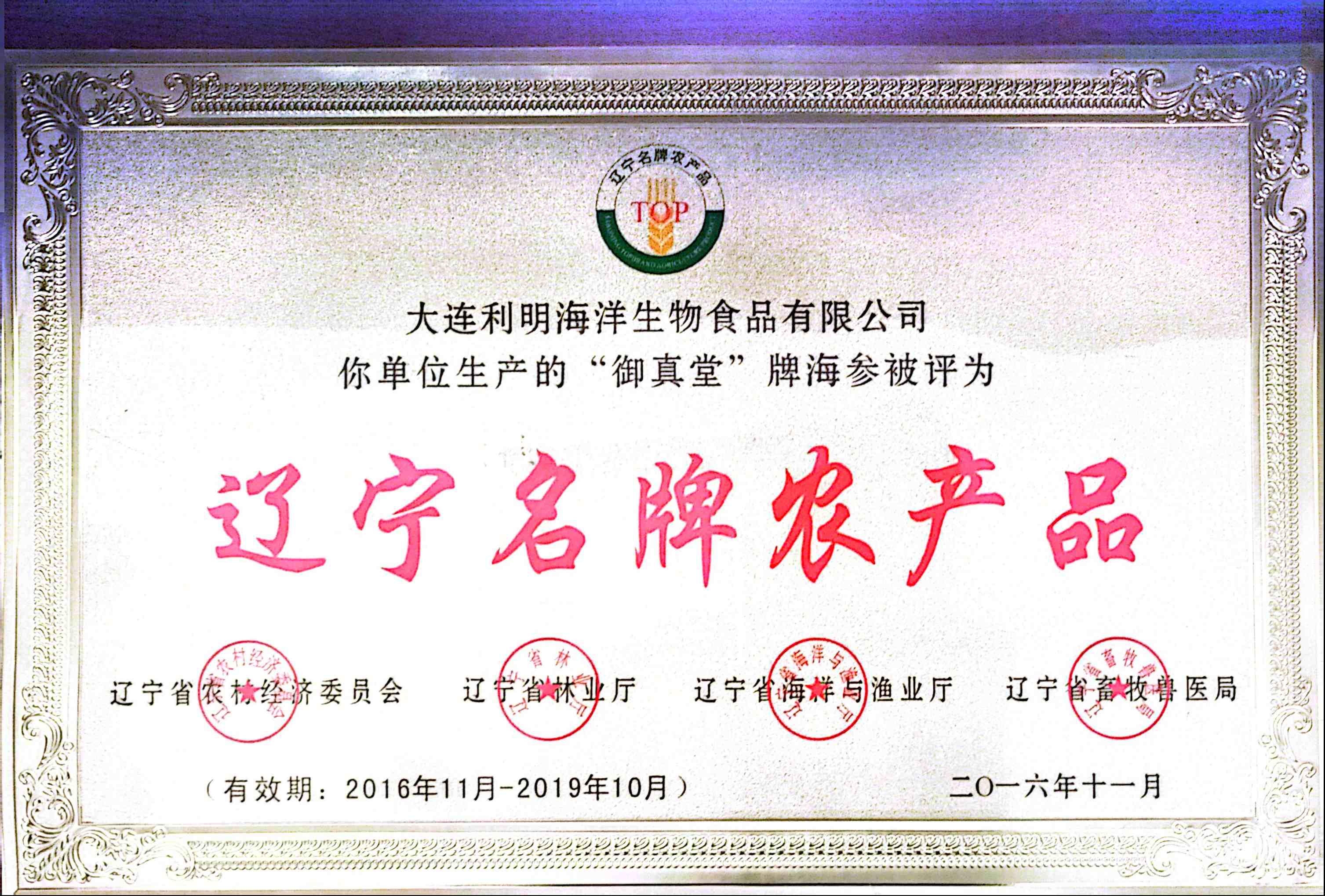 自2005年起,企业先后获得了渔业部无公害水产品产地、国家无公害水产品、国际农业博览会优质农产品、农业部水产健康养殖示范场、国际绿色产业协会绿色徽标、国际绿色产业协会会员、大连海参商会诚信倡导者品牌等殊荣。2008年,公司斥资成立大连御真堂海洋生物有限公司,作为总部公司的行政和运营总部 ,全面负责“御真堂 ”品牌系列产品和服务在全国的销售与推广。2010年公司全面导入中华五千年“和”文化核心理念,确立“倡导品质生活 ”品牌目标定位;理顺产业结构,强化专业价值服务,打造健康产业全业态产业链的战略布局和规划;同时创造性提出御真堂VIP'S专业价值整合营销服务全新模式。